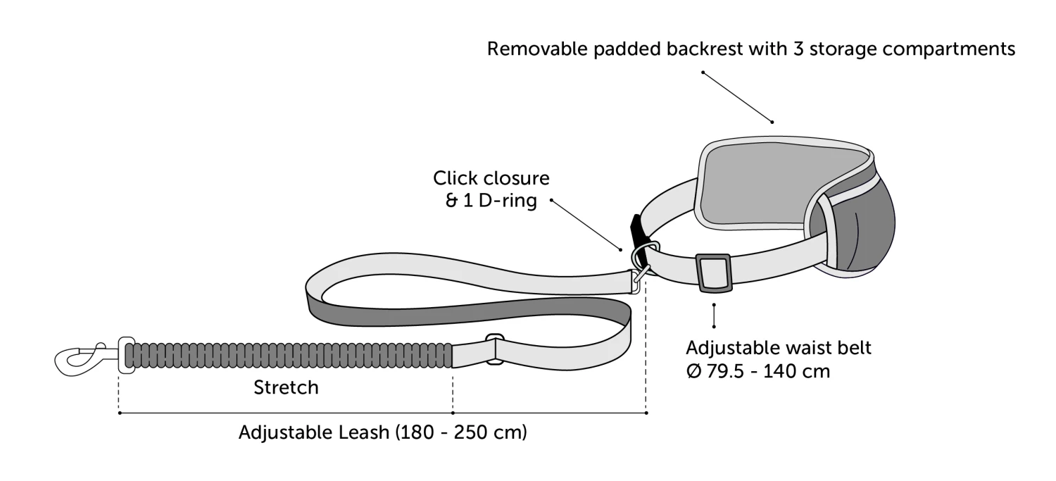 Faites une promenade ou du sport avec votre chien ! La ceinture ventrale est équipée d’un anneau en D solide auquel vous pouvez attacher la laisse à l’aide d’un mousqueton. Rembourrée pour un confort supplémentaire. Grâce à la boucle réglable, la ceinture est facile à mettre et à enlever. La laisse élastique absorbe les chocs lors de la marche. La ceinture ventrale dispose de 3 compartiments de rangement pratiques où vous pouvez mettre votre téléphone, par exemple.