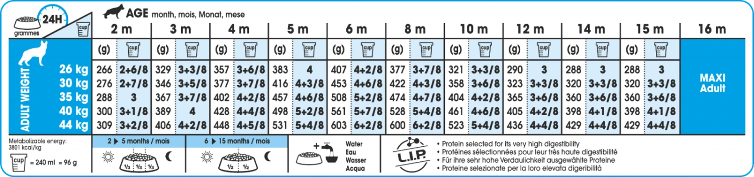Pour chiots de grandes races (poids adulte de 26 à 44kg) – de 2 à 15 mois.